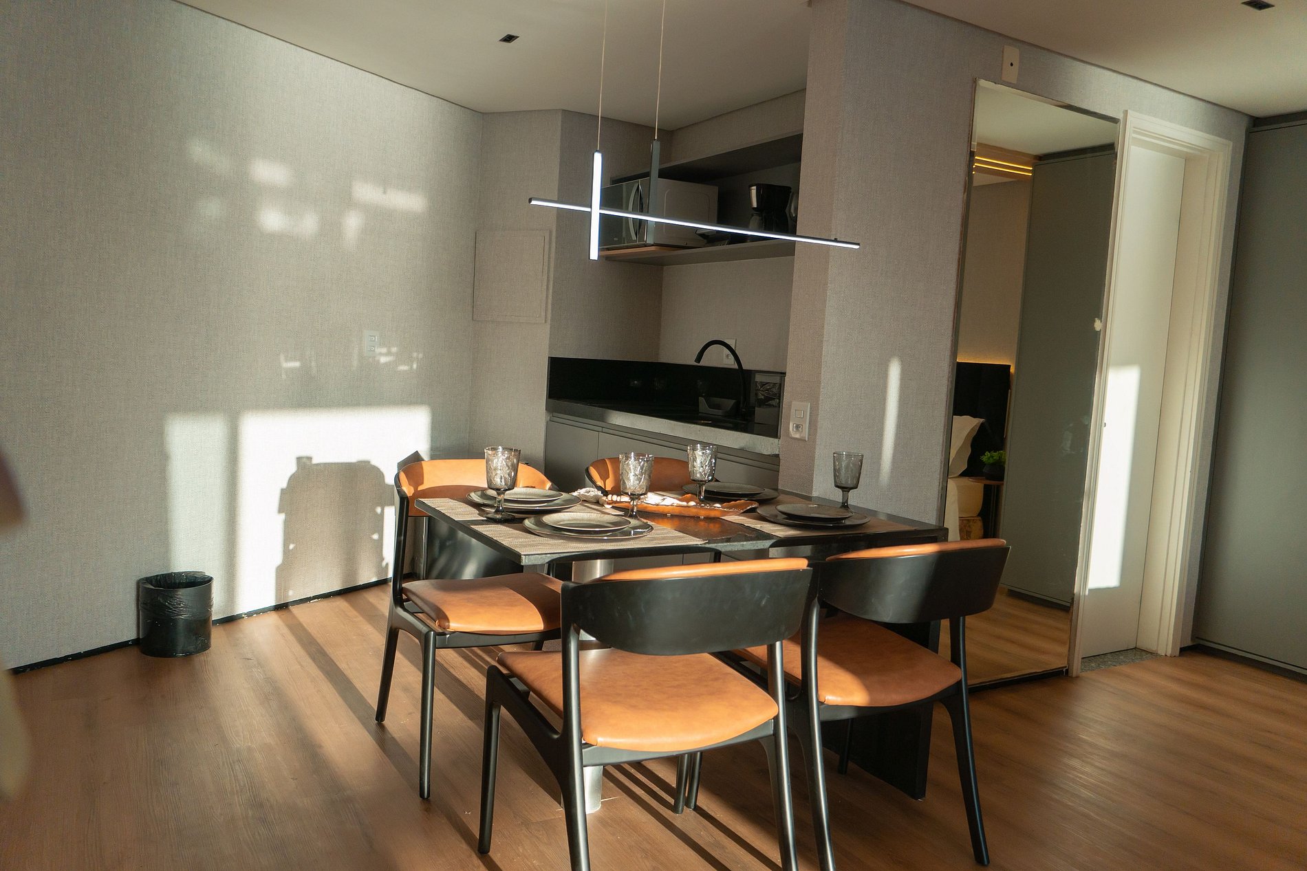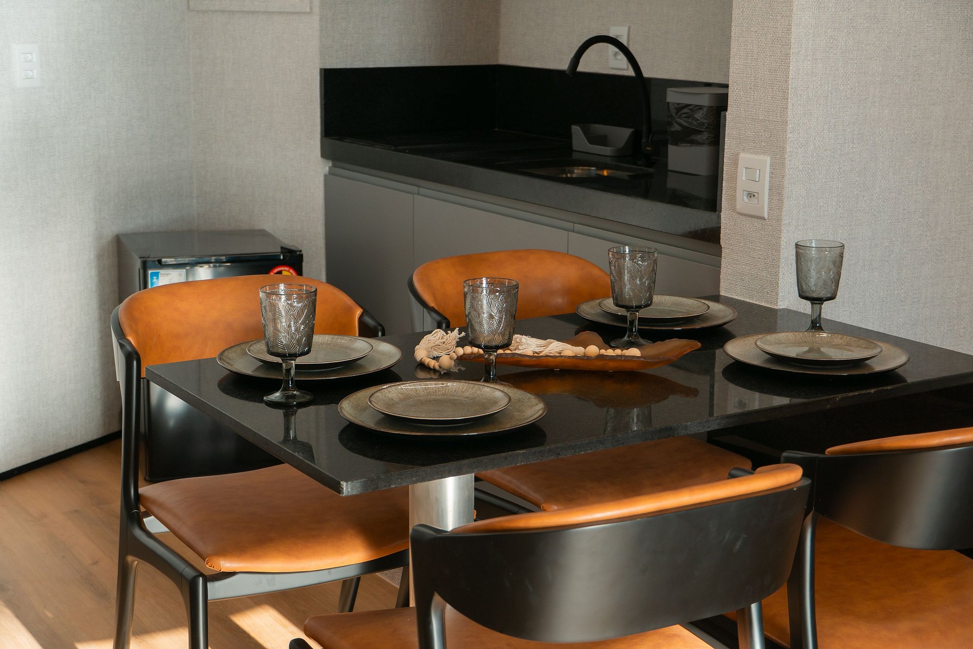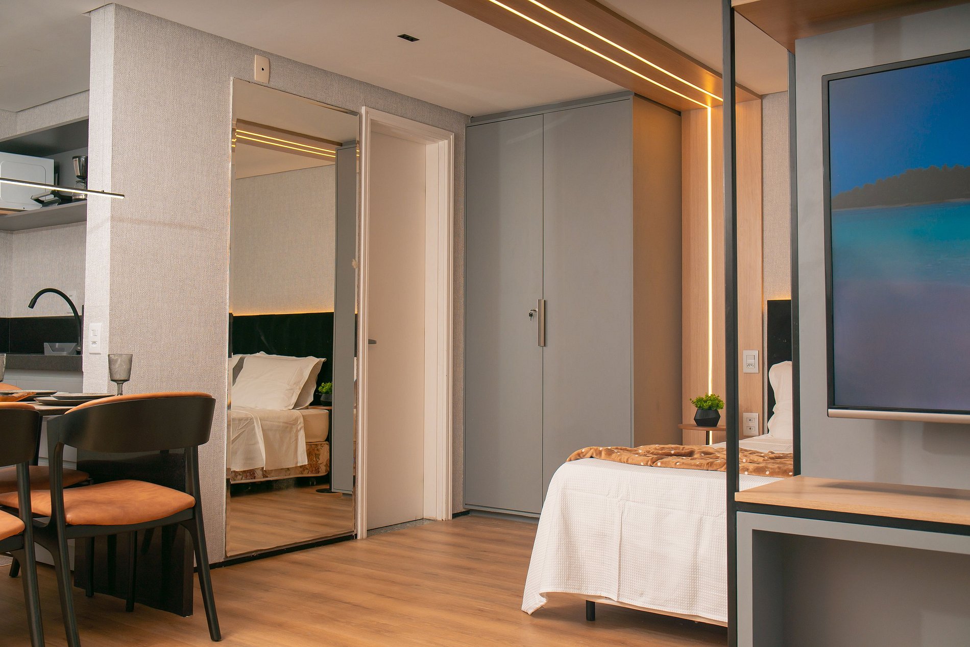 O interior do flat foi pensado para oferecer conforto e praticidade. A cama king size garante noites de sono relaxantes, a cozinha completa permite preparar suas próprias refeições com facilidade, e o ambiente climatizado proporciona bem-estar em qualquer época do ano.