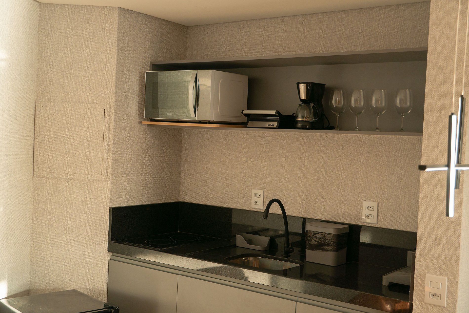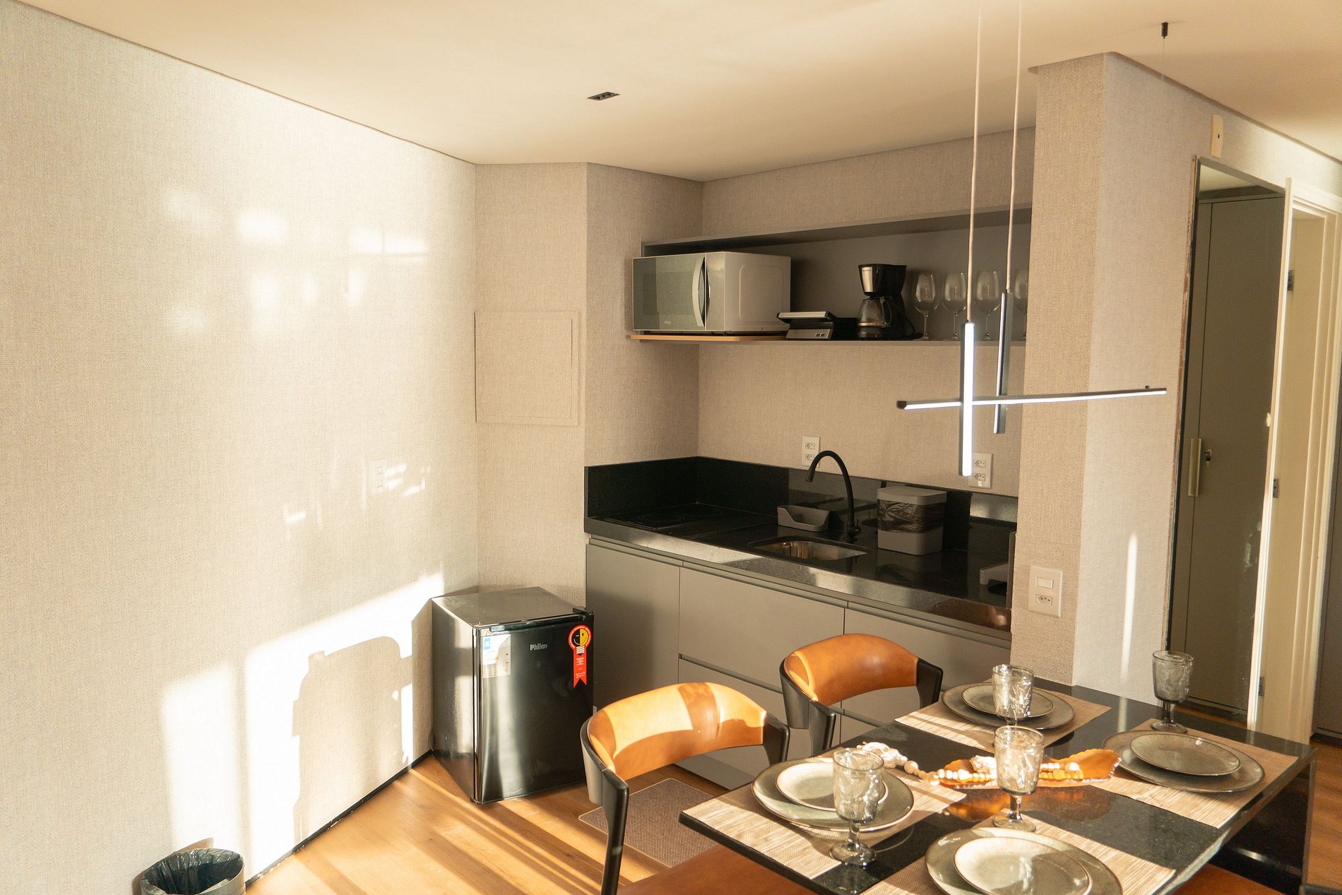 - Cozinha equipada com geladeira, fogão, micro-ondas, cafeteira e utensílios